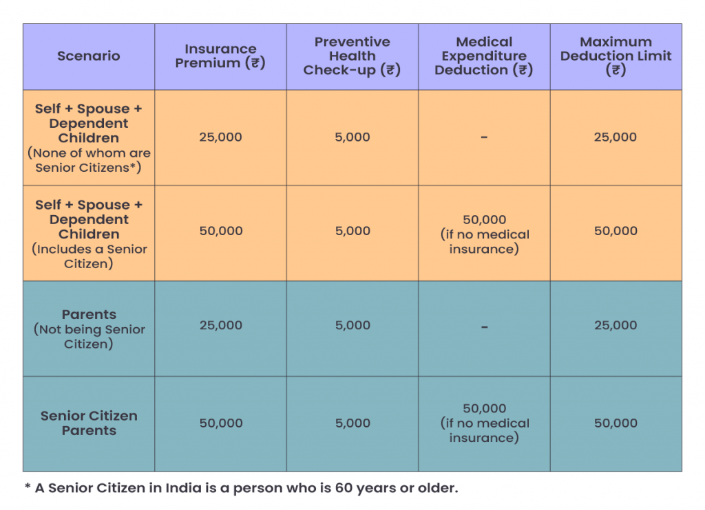 - Self + Spouse + Dependent children: the maximum deduction allowable is ₹50,000