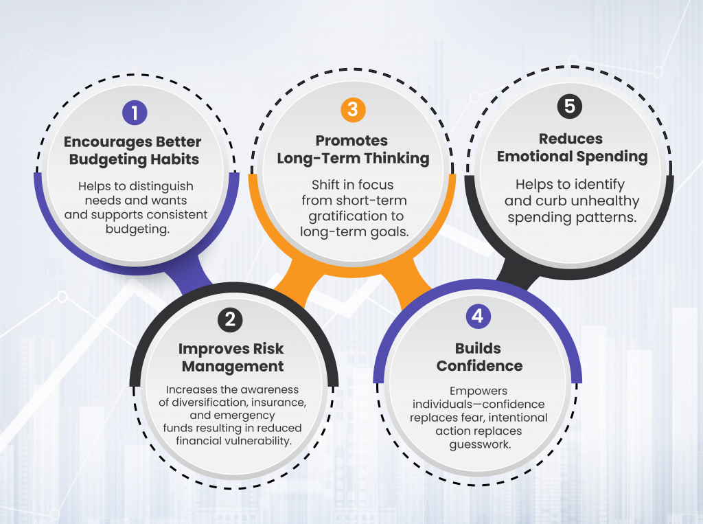 The core objective of financial education is to enable informed financial decisions. It goes beyond understanding concepts like interests, inflation or mutual funds and encourages a systematic approach towards setting budgets, financial goals, resist impulsive spendings and achieve financial stability. Financial education not only guides people to make decisions based on knowledge instead of emotion or habit, but also gradually transforms those underlying habits and emotional patterns.