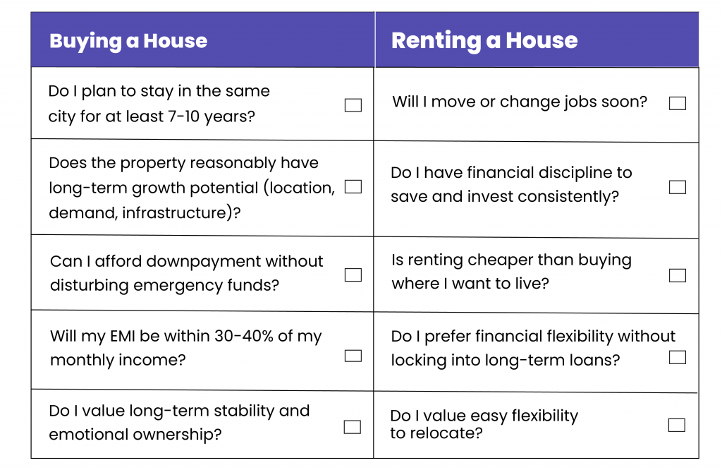 Buying is not always a smarter choice and Renting is not always waste of money. It is not at all one-size-fits-all answer. One needs to evaluate various critical factors discussed above to arrive at a right decision. It is a mix of numbers and emotions, both equally important. The best decision would be the one which balances your financial and emotional goals. To make it easier, here’s a simple self-evaluation checklist that aids in your decision journey: